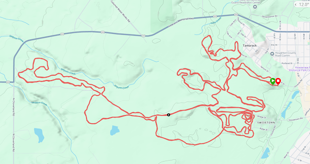On Sunday morning, before driving home, we skated at Michigan Tech. This was only my second time skiing the trail system. We had about half an hour of perfect conditions before it started seriously transforming. But there was still some snow in the trees and it was pretty. We skied down to the low-point of the course on the Skidder trail which had some fun turns. When we'd skied here in 2021 we'd skied the Cemetery Loop on very icy conditions. I didn't really want to do that trail again but we did and there is one super steep hill out there that almost got me again.